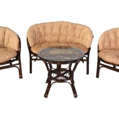 Комплект из натурального ротанга, состоящий из двух кресел и круглого столика с плетеной столешницей. Стекло входит в комплект.